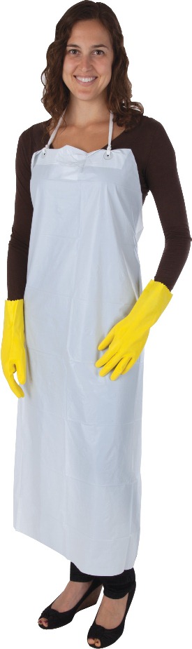 White vinyl apron, 6 mil. 35" x 45", individually packed.